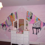 This mural was so much fun to design. SO girly. I worked with Sophia and her mom choosing colors, dresses, purses, shoes, boots, boas, crystal chandeliers etc.. Deciding how to display everything was tricky until I came up with the faux shelving idea. I separated the walls with cubbyholes to hold